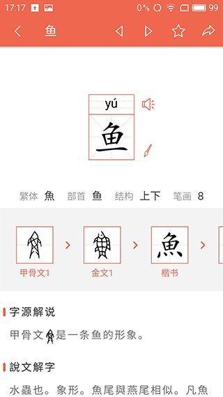 我觉得这个app特别适合学生党,尤其是小学生,用来学习汉字起源会很有帮助。另外,软件里还加入了各种有趣的讲解和分享功能,比如每日一字的学习、精美的字形卡片,可以轻松分享到朋友圈。对于书法爱好者来说,了解汉字的演变过程也能激发创作灵感。