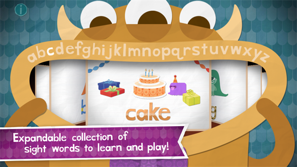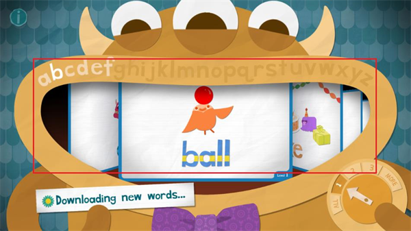 2、点击之后,萌系小怪物们就会把几个字母搬进屏幕,然后你就可以带着你的孩子正是开始英文单词学习喽。把每个字母填进相应的空缺中去,就完成了一个字母的挑战。