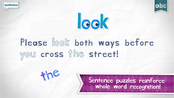 5、接下来, 各种萌系小怪物蜂拥而至,搬着刚刚拼好的单词跟含有这个单词的句子,让你的孩子跟你一起用填空的形式来完成。