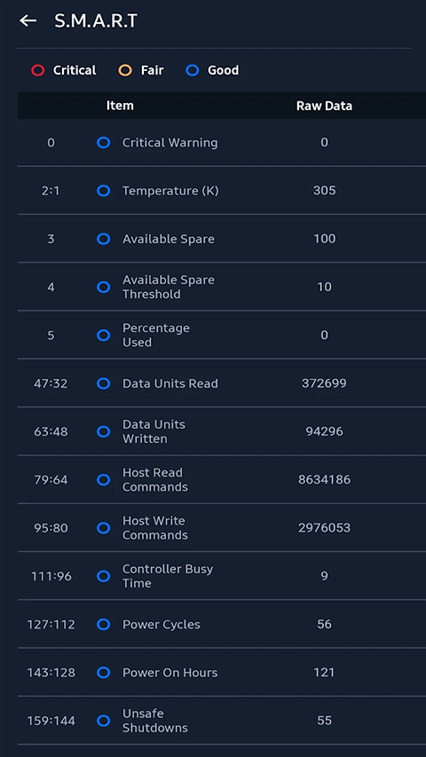 用户可以快速了解硬盘的总体健康状况、温度、性能、优化率等实时信息,并进行S.M.A.R.T.检查,提前检测潜在故障。