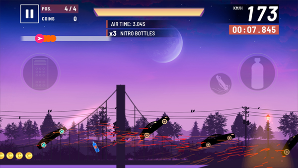 游戏的画面也超级棒,虽然是2D画风但场景却非常有沉浸感,像城市公路、林间晚霞、夜间城市这些场景都设计得很细致。操作简单直观,左侧是加速和刹车,右侧是道具控制,右上角还能看到行驶里程数。完成任务后会解锁各种奖励,比如新车辆和环境。