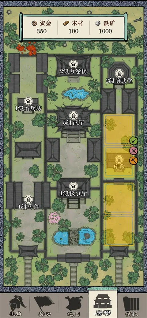 2、升官后你一时间修家,优先练武场-议事厅(每回合送资源和好感度)-兰亭和书斋-冶兵坊-马舍,剩下的……都可以不修了,修也行。