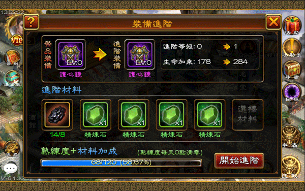 紫色质量以上装备,可以进行进阶强化喔,只要拥有两件相同的装备,就可以透过进阶变成+1的装备,当然,有两件+1的装备也可以变成+2啦!注意喔,进阶后祭品装备会消失喔。