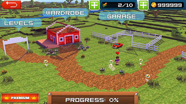左边的大门是通往关卡的入口,点击红色的房子可以改变主角的性别容貌,右边的车库我们可以更换使用的汽车或者升级。