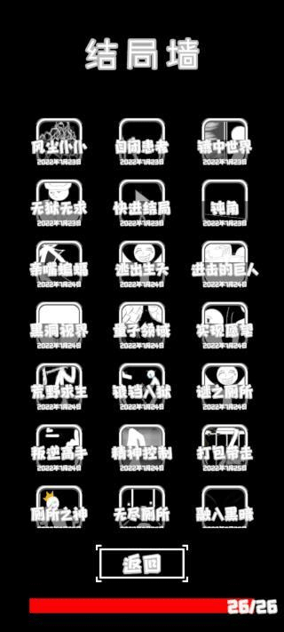 《厕锁2官方版》是一款魔性搞笑的文字解谜游戏,在延续前作经典玩法的基础上加入更多趣味挑战。玩家需要帮助被困在厕所的主角做出各种选择,触发奇葩剧情。游戏中有很多物品可以使用,每个结局都带有魔性又上头的特点,带来独特的体验。游戏操作简单,风格幽默,黑白配色让文字清晰呈现,整体设计很到位。