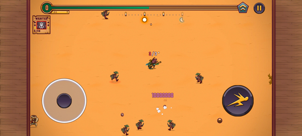游戏背景设定在狂野西部,你曾经是那里的英雄,但现在成了通缉犯,得拿起武器证明自己的清白。操作方面比较简单,角色会自动射击,玩家主要控制移动躲避子弹。每次击败敌人会获得经验升级,还能选择强化技能。不过一旦生命值耗尽就GameOver了。