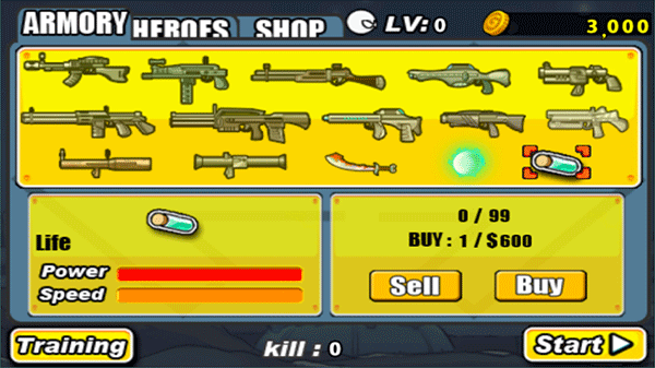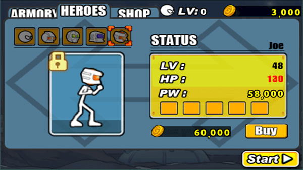 1、5种角色,玩家可以从5位英雄火柴人中进行选择,完成关卡提升等级,升级他们的属性。