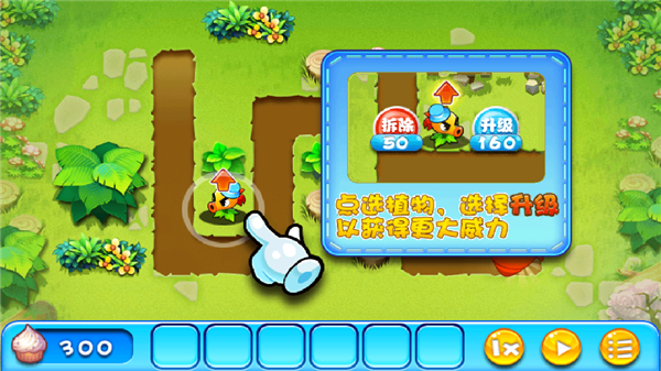 7、每当这个植物上面有一个向上的箭头就可以点击植物选择升级,这样就可以让它的威力越来越厉害了哦。