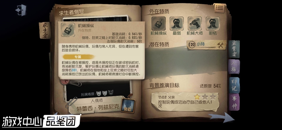 机械师随身携带玩偶遥控器,可以操控玩偶破译密码机,在机械师被抓上椅子时也可以利用玩偶破译密码机。虽然经过削弱,但机械师依然是现在版本最强的修机位,拥有最快的破译速度。