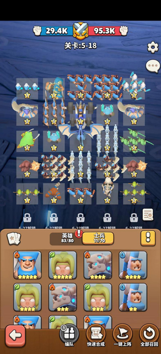 除英雄外,士兵也是玩家进行战斗的一个重要组成部分。在此处,玩家可以给自己的士兵们进行选召和熔炼,提升他们的等级和战斗力,获得更高等级的士兵组。