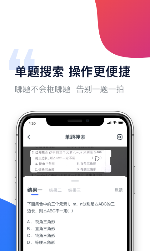 使用“拍整页”模式,将整页作业置入相机拍摄范围内,即可一键检查作业。选择题自动批改,其他的可通过搜到的题逐个核查,手动标记对错。通过即时的作业反馈,快速地定位知识上的缺漏,作业、学习都将更有针对性,更高效。