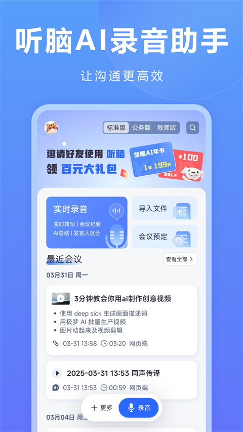 听脑AI手机版是一款非常实用的语音转文字工具,支持实时高效转写,识别率高达98%。无论是通话录音、手机内录还是网络音频,它都能精准识别,并通过智能AI模块自动总结关键信息,帮助用户快速梳理会议要点和代办事项,提高工作效率。