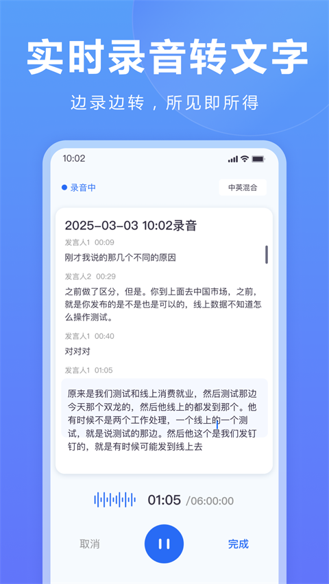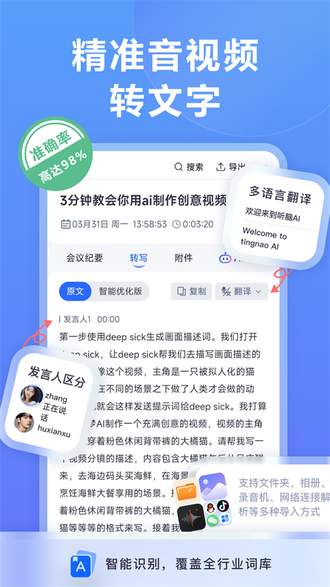 1、实时精转文字:支持自动区分发言人,去噪、人声增强等AI功能,精准识别 56+ 行业专业术语,准确率高可达98%