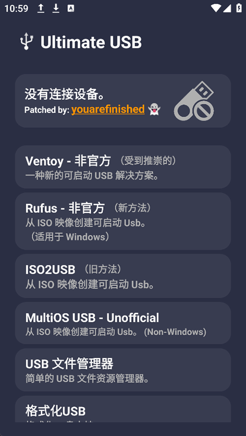 在安卓上的Ultimate USB App 中制作U盘启动盘,主要通过其内置的 "RAW 写入"(RAW Write) 或 "Ventoy 安装" 功能实现。