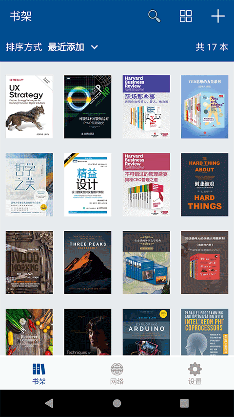 允许以「列表」或「网格」的方式展示导入图书的详细信息,同时还可以通过长按图书,展示更多的,如「标签」和「简介」等图书信息