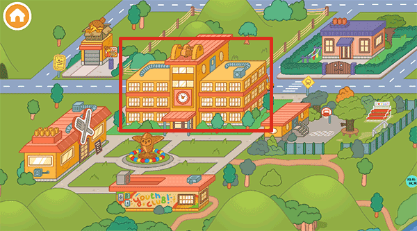 1、打开游戏,一共有六大场景可以选择,这里举例学校场景,找到并点击红色方框内的场景按键;