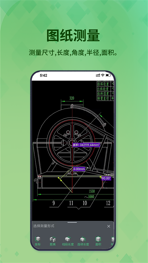 二维图纸测量:支持快速测量CAD图纸中的长度、距离、坐标、半径、周长、角度、面积等尺寸数据。三维图纸测量:快速测量3D模型中的距离、长度、角度、半径、面积、体积、重量等数据。