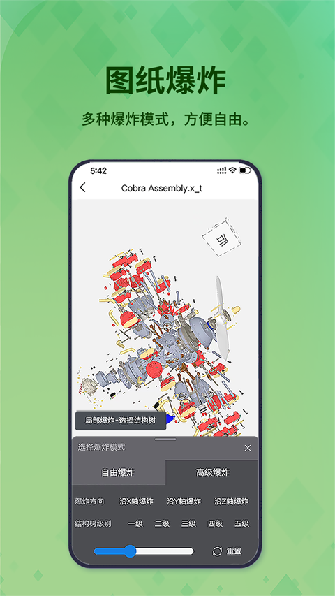 提供强大的3D模型和2D图纸查看交互操作功能,可进行多角度、全方位查看产品3D模型外观结构和内部结构,支持手机直接交互浏览3D模型和CAD图纸,提供:测量、视角、剖切、结构树、爆炸、拖拽、平移、缩放、旋转,显示隐藏等多种交互看图功能。