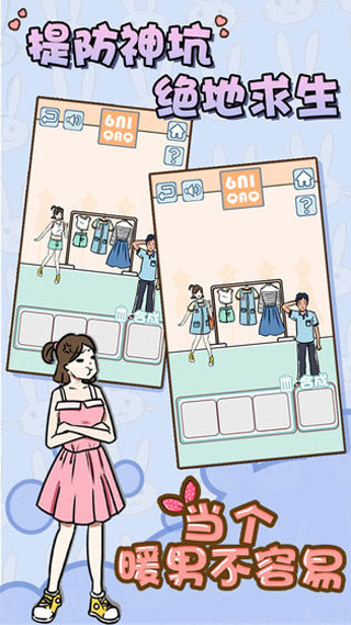 这款游戏《当个暖男不容易》看起来挺有意思的,是个解谜游戏,主题是模拟谈恋爱的过程。玩家扮演一个青涩男孩,通过完成各种搞笑又温馨的关卡来打动女生,听起来像是一场“恋爱闯关大赛”。游戏里的美术风格青春搞笑,背景音乐也很轻松欢快,玩法主要是找线索、组合物品或者打破常规思维解决问题。