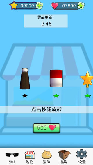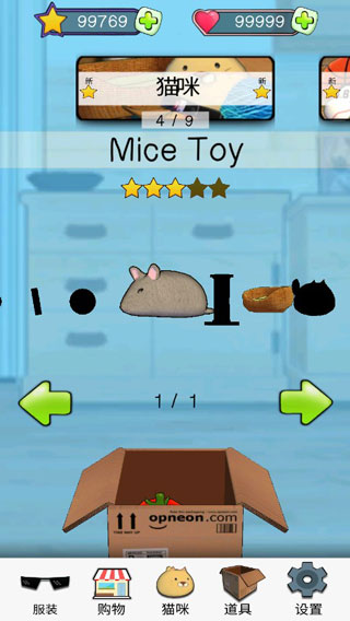 3、在商店、道具屋中选择购买各种物品,将其装进箱子,当在主界面中下滑会立即弹出,这样你就可以开始于猫咪互动了。