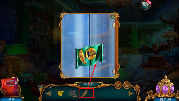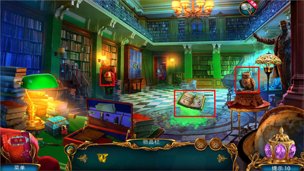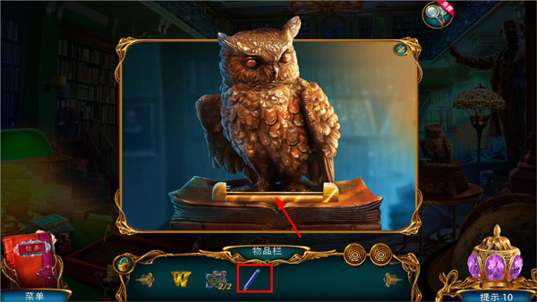 11、点击漂浮在中间的书,推出点击旁边的猫头鹰收集拼图嵌块,点击左手边红色布盖着的地球仪,打开获得紫外线灯还有拼图嵌块。