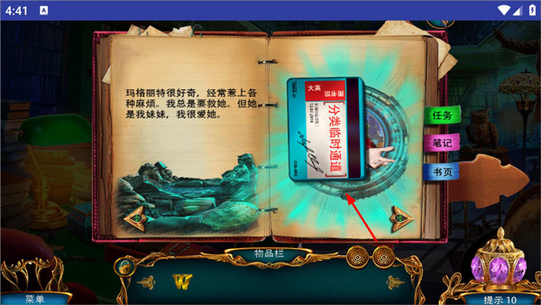 3、点击面前的桌子从上面拿到,黄金色W,再使用刚刚在妹妹处获得的钥匙,打开箱子获得任务书,一直翻开最后一页获得通行卡。