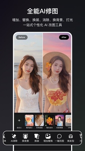 AI消除:一键涂抹就能精准删除多余物体,如去除路人、移除特效贴纸等。