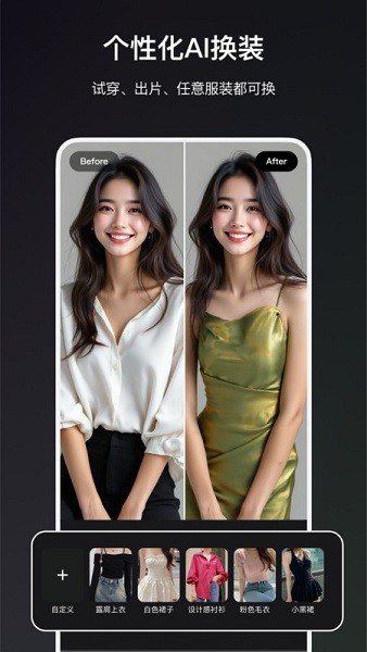 AI换装:支持自定义上传服装,还能搜索全网服装爆款,实现一键上身,也支持双人合照、cosplay、宠物换装等多图生成玩法。
