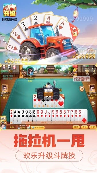 同城游升级拖拉机包括了多种玩法,比如两幅升级、拖拉机、四副牌等。升级游戏最初起源于山东,由于其趣味性,后来慢慢流行于全国。规则没有一点改变,大家应该很熟悉了;只是手机上玩起来更方便,大家可以随时来一两把,不用到处找人了。