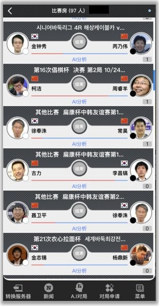 各大围棋赛事现场直播,职业棋手全程讲解,5款ai同步分析。