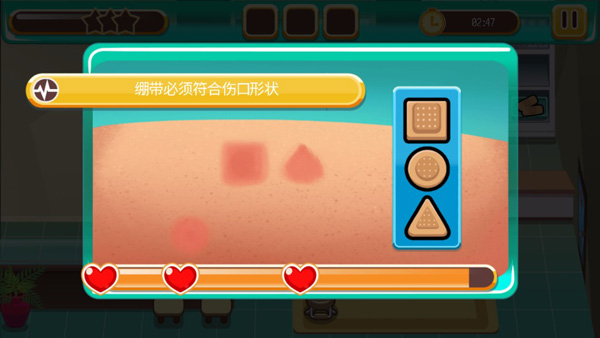 3、在治疗的时候不同的治疗方法可能会出现不同的小游戏来考验玩家们,贴创口贴的话玩家们需要在限定的时间内来将不同形状的创口贴贴到合适的位置,这样才能够完成治疗。