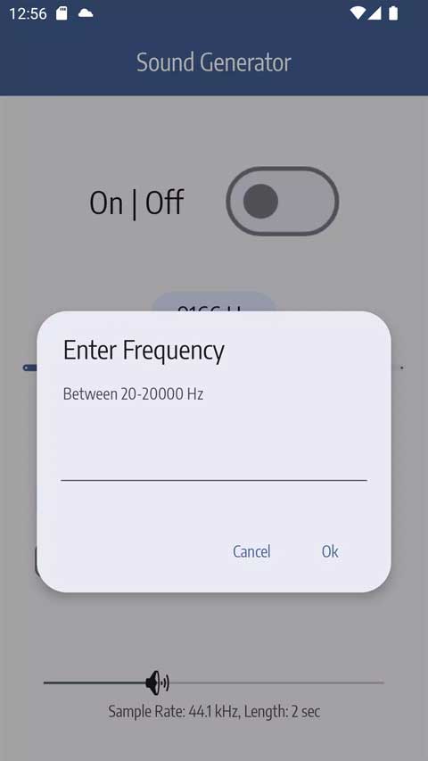 1、小编先给用户们介绍一下这款app它的功能划分以及作用。它主要分为了四个功能分区:开启/关闭按钮、频率调整、波的类型以及采样率。