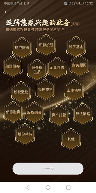 1、进入应用后选择身份,目前支持机构、高净值等大户投资者,也支持企业、政府相关融资平台的用户进行市场投资咨询