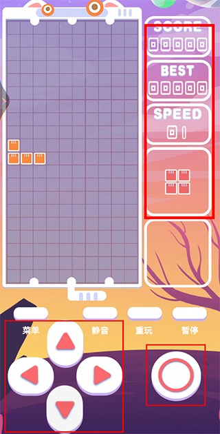 2、游戏操作方式:左下方为操纵方块行动方向,右下方圆形键为操纵方块自身转动方向,右侧边显示得分和下一回出行的方块类型;