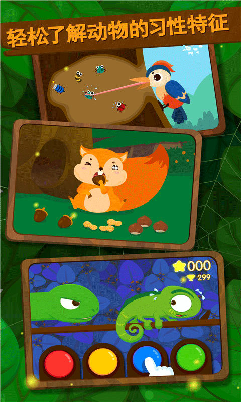 这款游戏挺有意思的,专门给小朋友们设计的森林冒险游戏。里面有五种可爱的动物,比如孔雀、松鼠、老虎和变色龙,每个都有自己的特点和互动玩法。游戏画面很干净,颜色也很讨喜,看起来就很舒服。教程简单易懂,小朋友自己就能玩,而且还能重复玩,不会觉得无聊。