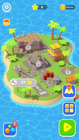 除了核心玩法,游戏还加入了小岛建设的元素。闯关时获得的星星数量决定了能否重建被暴风破坏后的小岛。因此,在挑战关卡时要尽量拿到满分哦!此外,游戏中还能通过收集钥匙来打开宝箱,每个宝箱都会掉落无限金币或彩色小球,完全靠运气!