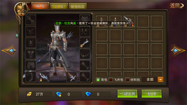 3、而获得的装备可以在背包这里进行装备,刚获取的新装备还支持一键替换。