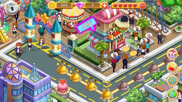 进入游戏,映入眼帘的是可爱精致的3D城市,城市里有各种餐饮店,游戏采用通关制,逐步提升烹饪难度,让玩家从新手变“老司机”。游戏内玩家根据顾客的菜单,使用正确的配方制作出食物,并在规定时间内完成上菜动作,顾客的满意度决定玩家的星级,3D场景结合2D人物,画面丰富有层次感。游戏中不断呈现世界各地的城市风貌以及各地的特色食品,单局游戏时间不会超过2分钟,是极为适合休闲娱乐,打发碎片时间的游戏品。