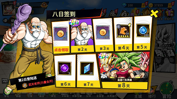 3、玩家在提升等级后即可解锁八日签到活动,累计签到八日可以领取UR武天老师和UR超赛贝吉特、超赛女布罗利、超粉黑悟空自选礼包以及高级英雄碎片、大量金币等。