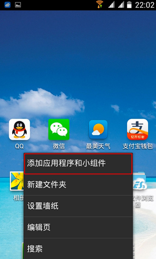 6、接下来将手机处于主屏状态,触摸“菜单键”或者直接选择添加“小组件”。