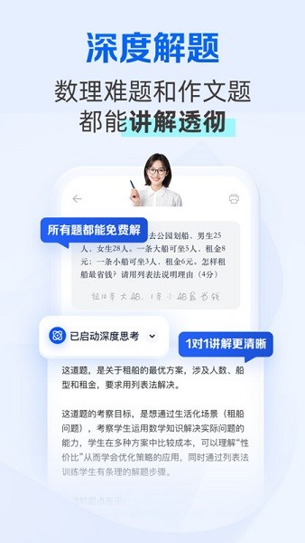 采用夸克宝宝虚拟形象讲解题目,基于大语言模型和视觉技术,提供 “考点分析”“详解步骤”“答案总结” 等内容,已上线全学段英语和小学数学语文场景,覆盖多种常考题型。