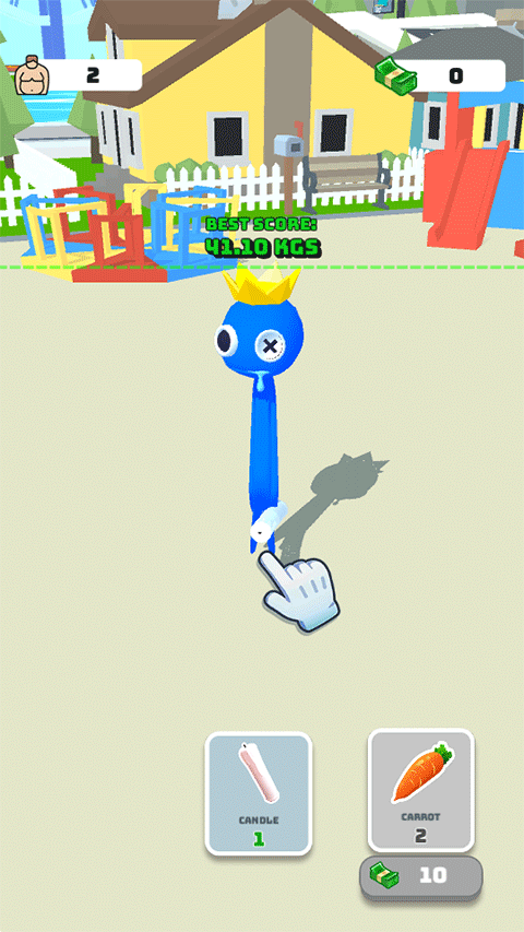 1、进入到游戏当中我们将扮演一名什么都吃的彩虹朋友,通过不断的吃食物从而增加体重更好的赚取钞票。