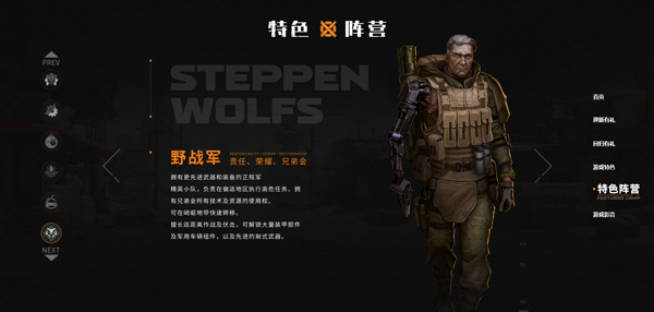 3、阵营:不同阵营将有不同的发展方向和特色,在对战匹配中,面对不同阵营可有多种战术。工程师是初始阵营,随着等级提升,可加入其他阵营,狂人阵营为近战,游民阵营有飞机部件,拾荒者和野战军属于远攻型