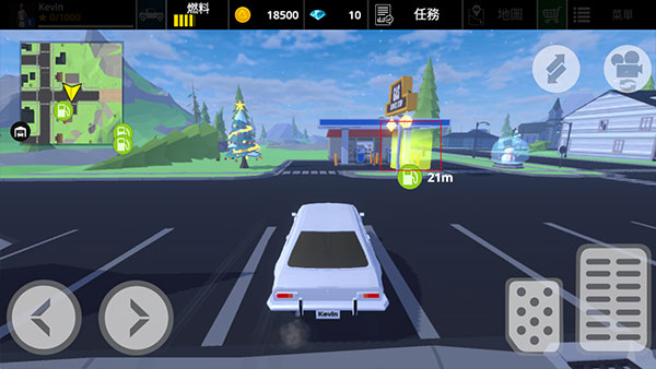 4、根据左上角的地图查看地图的加油站所在的位置,左侧的箭头可以控制汽车方向,右上方的双向箭头可以挪车,摄像头可以切换开车视角,右侧分别是刹车和油门。