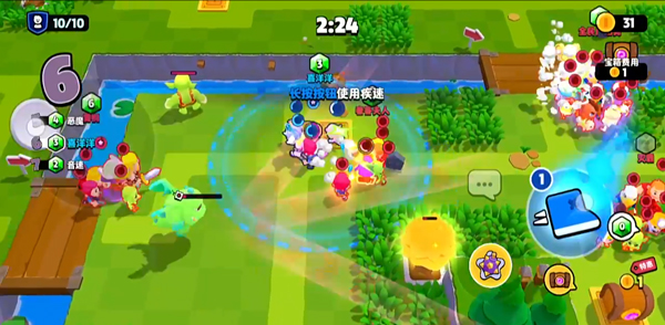游戏有两个主要模式:小队模式和双人模式。在小队模式中,玩家需要和其他九支小队竞争,争夺最多的宝石来获胜;而在双人模式下,玩家可以和好友一起对抗其他三支队伍。游戏的操作方式也很简单,左边控制移动,右边负责攻击和技能释放。