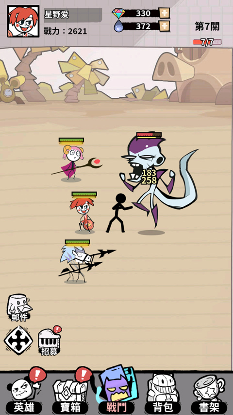 同时游戏设计了超多有趣搞笑的火柴人角色,他们不仅外貌造型各异,而且各自有着不同的能力,玩家可通过打怪闯关获取宝箱来抽取角色,或通过招募等方式来获得。