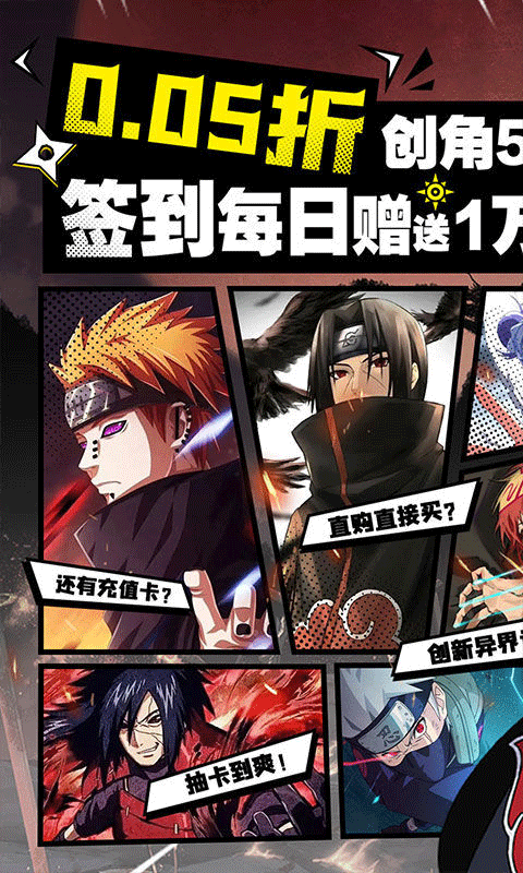 登录奖励:累计登录14天可获得鼬、千手扉间(多次)、佩恩、修罗道、神威卡卡西、秽土波风水门、仙人鸣人、须佐鼬等强力角色。其中千手扉间、秽土波风水门、须佐鼬为神话品质,前期可通过小额充值快速提升星级。