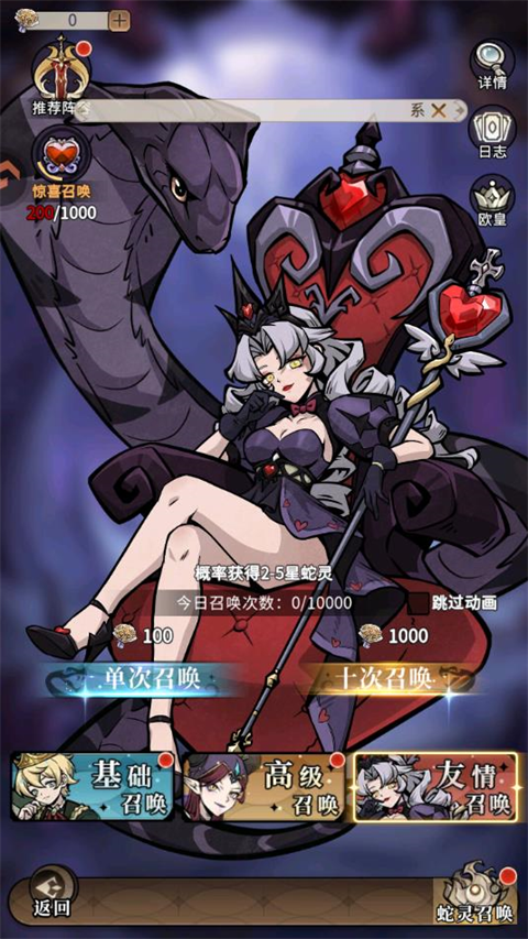 幻灵召唤师是一款暗黑童话风格的放置卡牌手游,玩家扮演蛇灵召唤师,在被黑暗笼罩的童话镇中招募各种强大的蛇灵。通过提升等级、穿戴装备和升星等玩法,可以增强蛇灵的实力,合理搭配阵容更是能组建出一支所向披靡的战队。游戏玩法多样,包括探索地牢、参加蟒蛇杯挑战和其他玩家竞技,还有各种趣味小游戏让体验更加丰富。