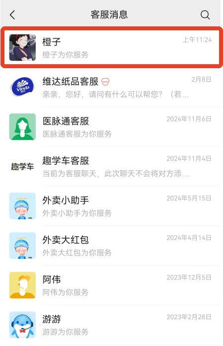 4、如果之后想再次找客服可以按照上面的方法,或者直接来到微信聊天列表找到【客服消息】点击进入,就能看到我们之前找过的客服了。