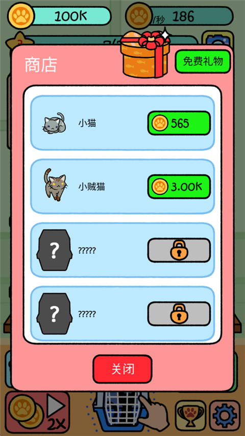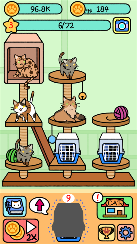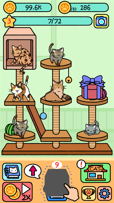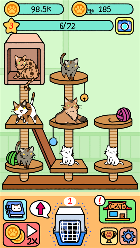 萌宠派对手机版是一款休闲放置游戏。盲盒解锁各种稀有品种的猫咪,亲手培养自己的猫咪,轻轻松松的游戏,没有一点压力,不占用过多的时间。玩家只需要点击开启猫箱获得猫咪,通过相同的猫咪合成新的品种的猫咪,每一次解锁猫咪都会记录在你的相簿中,猫咪会自动生产金币,金币可以在商城中直接购买猫咪进行合成。游戏每一次合成都将获得相应经验值,升级后可解锁全新的空间,帮助你放置更多猫咪。